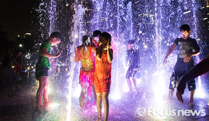 (서울=포커스뉴스) 폭염과 열대야가 지속되고 있는 5일 오후 서울 여의도 한강공원 내 물빛광장을 찾은 시민들이 물놀이를 하며 더위를 식히고 있다.