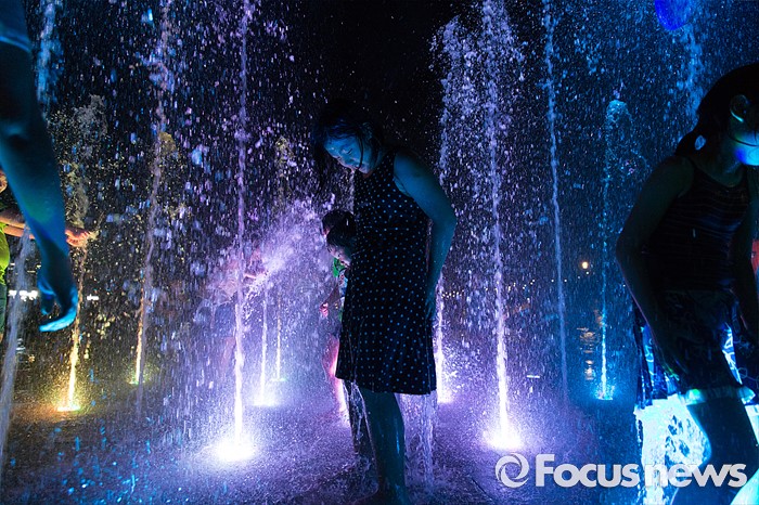 (서울=포커스뉴스) 폭염과 열대야가 지속되고 있는 5일 오후 서울 여의도 한강공원 내 물빛광장을 찾은 시민들이 물놀이를 하며 더위를 식히고 있다.