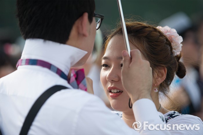 (서울=포커스뉴스) 6일 오후 서울 중구 시청 앞 광장에서 열린 '서울 스윙댄스 페스티벌'에서 청년문화예술단체 딴따라땐스홀 회원들이 서로의 복장을 챙겨주고 있다.
