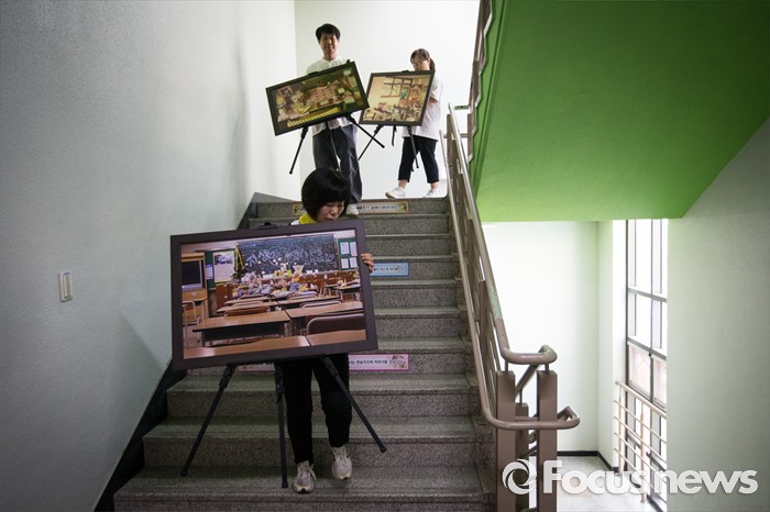 (안산=포커스뉴스) 세월호참사 이후 새로운 교육을 위한 사회적 합의에 따라 6일 오후 경기도 안산시 단원고등학교에서 교실 이전을 위한 준비 작업이 진행되고 있다. 교실 이전 준비를 돕기 위해 단원고에 온 참석자들이 교실 및 교무실을 찍은 기록물들을 단원고에서 분향소로 옮겨 가고 있다.