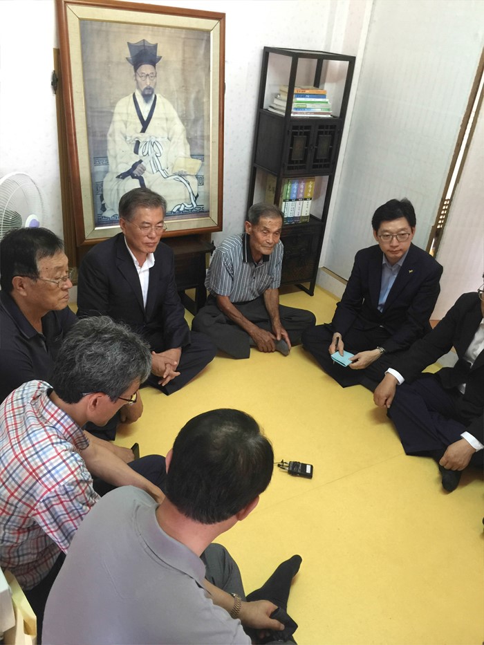 (서울=포커스뉴스) 문재인 더불어민주당 전 대표가 7일 오전 전남 광양 봉강면 매천 황현 선생 생가를 방문해 관계자들과 대화하고 있다. <사진제공=문재인 전 대표측>