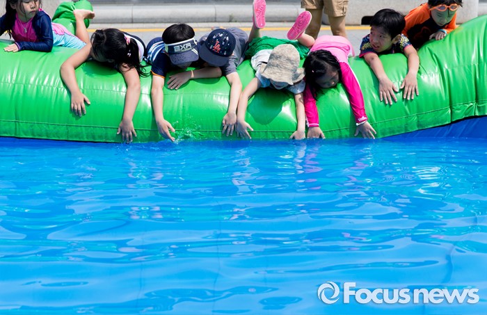 (서울=포커스뉴스) 절기상 입추인 7일 오후 서울 종로구 광화문 세종대로에 설치된 물놀이장에서 어린이들이 풀장에 들어가기 위해 기다리고 있다.