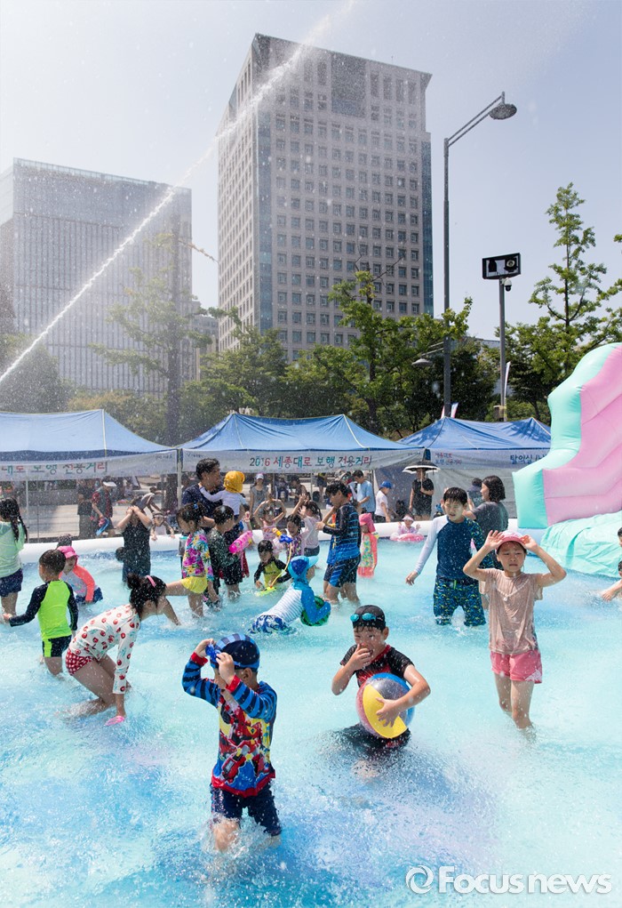 (서울=포커스뉴스) 절기상 입추인 7일 오후 서울 종로구 광화문 세종대로에 설치된 물놀이장에서 어린이들이 즐거운 시간을 보내고 있다.