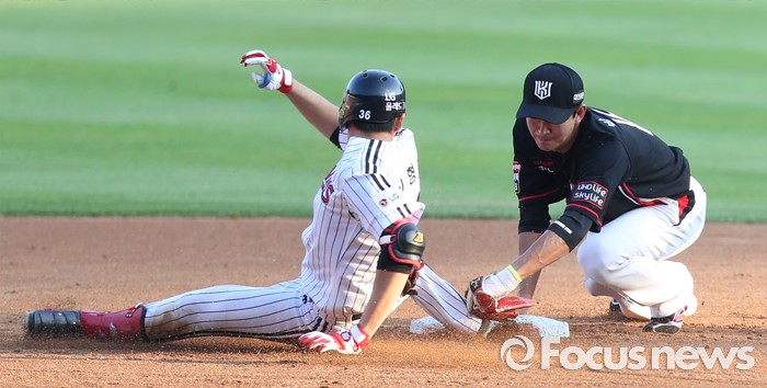 (서울=포커스뉴스) 5일 서울 잠실구장에서 열린 2016 프로야구 kt-LG 경기 2회말 2사후 LG 이형종이 좌익수 왼쪽 펜스를 맞히는 안타를 치고 2루에서 kt 2루수 박기혁의 태그를 피하며 슬라이딩하고 있다. 세이프된 이형종은 합의판정에서 아웃으로 번복되었다.