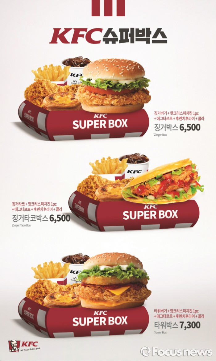 슈퍼박스는 KFC의 베스트셀러 버거인 징거버거·타워버거·징거타코 3종으로 나왔다. 여기에 핫크리스피 치킨과 에그타르트, 감자튀김, 매장에서 무제한 리필 가능한 음료가 함께 구성돼 있어 5가지 메뉴들을 한 번에 즐길 수 있다.