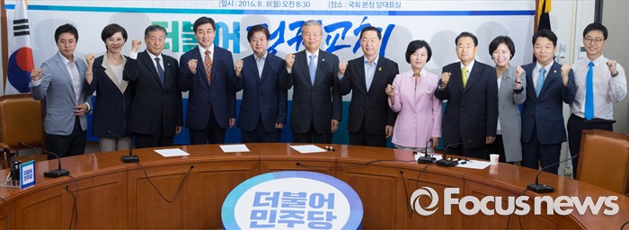(서울=포커스뉴스) 8일 오전 서울 여의도 국회에서 열린 더불어민주당 당대표 및 부문별 최고위원 선출을 위한 공명선거 협약식에 참석한 당대표 및 최고위원 후보자들이 취재진을 향해 포즈를 취하고 있다. 왼쪽부터 이동학, 유은혜, 제정호 최고위원 후보, 이종걸 당대표 후보, 노웅래 선거관리위원장, 김종인 비대위 대표, 김상곤, 추미애 당대표 후보, 송현섭, 양향자, 김병관, 장경태 최고위원 후보.