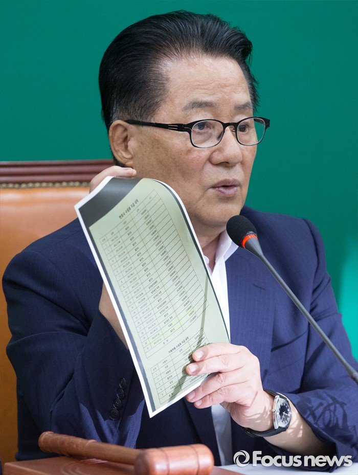 (서울=포커스뉴스) 8일 오전 서울 여의도 국회에서 열린 국민의당 비상대책위원회의에 참석한 박지원 비대위원장이 우병우 청와대 민정수석과 홍만표 변호사의 공동 변론 변호사 수임료 지급내역 관련 문서를 들고 발언하고 있다.