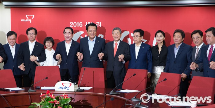 (서울=포커스뉴스) 김희옥(오른쪽 여섯번째) 새누리당 혁신비상대책위원장과 정진석 원내대표, 김광림 정책위원장을 비롯한 비대위원들이 8일 오전 서울 여의도 새누리당사에서 열린 마지막 혁신비상대책위원회 전체회의에서 포즈를 취하고 있다.