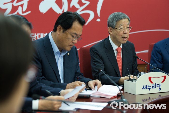 (서울=포커스뉴스) 김희옥(오른쪽) 새누리당 혁신비상대책위원장이 8일 오전 서울 여의도 새누리당사에서 열린 마지막 혁신비상대책위원회의에 참석해 모두발언을 하고 있다.