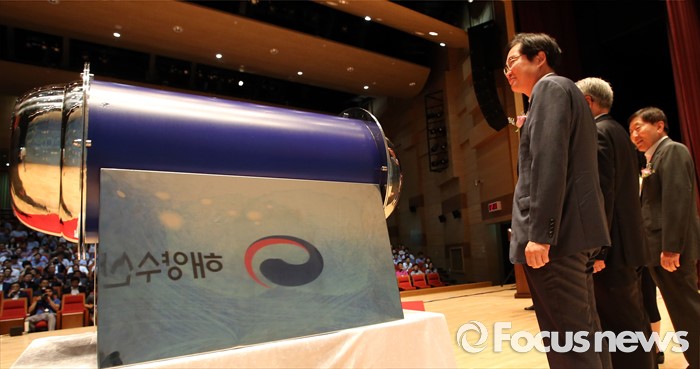 (세종=포커스뉴스) 8일 오전 세종시 정부세종청사 대강당에서 열린 해양수산 통합행정 20주년 기념식에서 김영석 해수부장관이 해양수산 자료가 담긴 타임캡슐을 바라보고 있다.