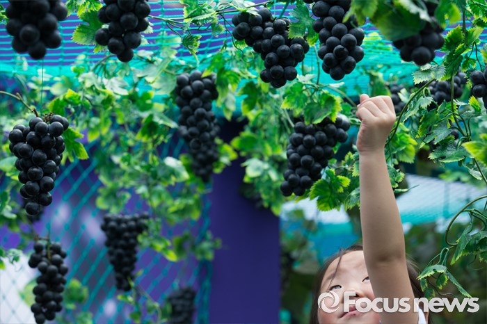 (서울=포커스뉴스) 8일 오전 서울 광화문광장에서 열린 '2016 포도데이' 행사에 참석한 한 어린아이가 포도를 따고 있다.