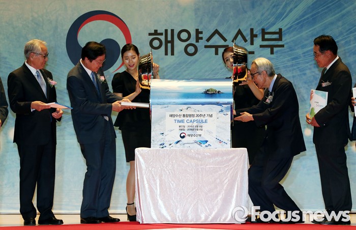(세종=포커스뉴스) 8일 오전 세종시 정부세종청사 대강당에서 열린 해양수산 통합행정 20주년 기념식에서 김영석 해수부장관 및 역대 장, 차관들이 해양수산 자료가 담긴 책자를 타임캡슐에 넣고 있다.