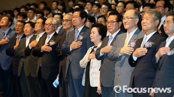 (세종=포커스뉴스) 8일 오전 세종시 정부세종청사 대강당에서 열린 해양수산 통합행정 20주년 기념식에서 김영석 해수주장관 및 역대 장, 차관들이 국기에 대한 경례를 하고 있다.