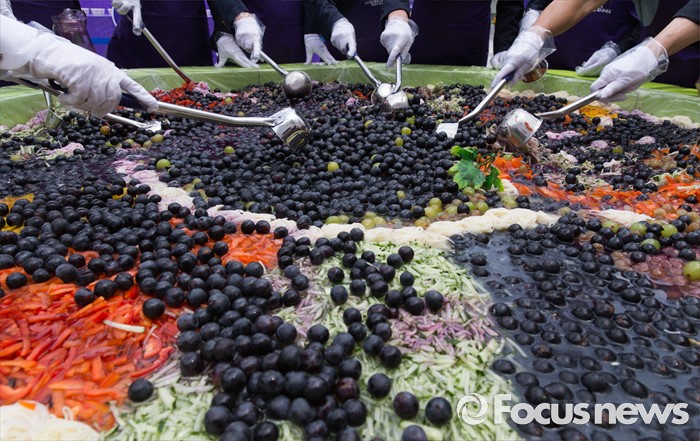 (서울=포커스뉴스) 8일 오전 서울 광화문광장에서 열린 '2016 포도데이' 행사에 참석한 내빈들이 국자를 들고 포도 냉소면을 만들고 있다.