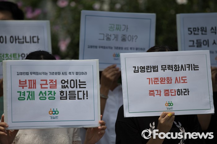 (서울=포커스뉴스) 8일 오전 서울 종로구 정부서울청사 정문 앞에서 열린 김영란법 무력화시키는 기준완화 시도 중단 촉구 기자회견에서 경제정의실천시민연합(경실련) 회원들이 피켓을 들고 있다.