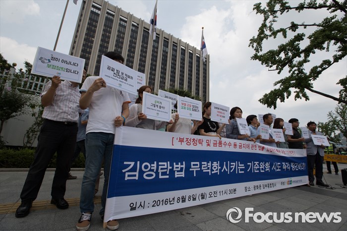 (서울=포커스뉴스) 8일 오전 서울 종로구 정부서울청사 정문 앞에서 경제정의실천시민연합(경실련) 회원들이 김영란법 무력화시키는 기준완화 시도 중단 촉구 기자회견을 하고 있다.