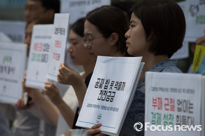 (서울=포커스뉴스) 8일 오전 서울 종로구 정부서울청사 정문 앞에서 열린 김영란법 무력화시키는 기준완화 시도 중단 촉구 기자회견에서 경제정의실천시민연합(경실련) 회원들이 피켓을 들고 있다.
