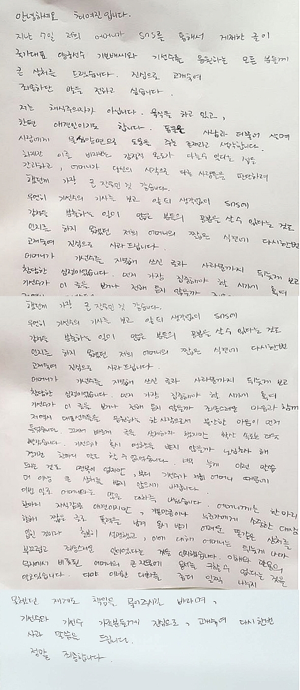 한자 한자 눌러쓴 자필 사과문을 통해 최여진은 거듭 사죄의 뜻을 밝히며 모친의 잘못과 이를 막지 못한 자신의 실수를 인정하는 모습을 보였다.