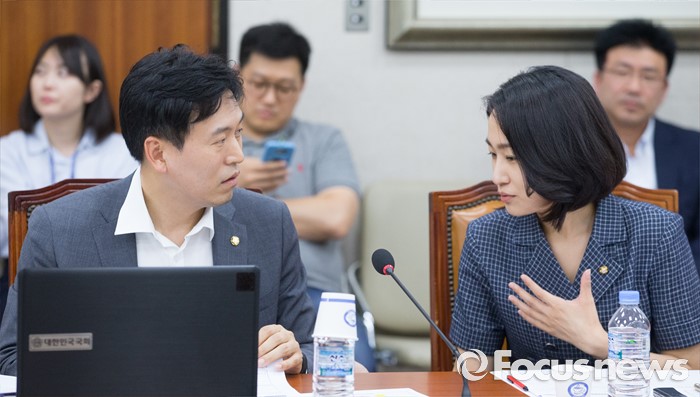 (서울=포커스뉴스) 8일 오후 서울 여의도 국회에서 열린 산업통상자원위원회 전체회의에 참석한 김수민(오른쪽), 손금주 국민의당 의원이 대화하고 있다.