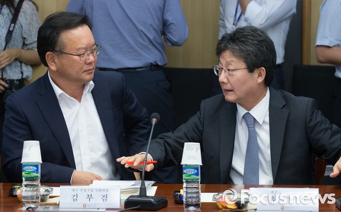 (서울=포커스뉴스) 8일 오후 서울 여의도 국회 의원회관에서 열린 광주시-대구시 예산·정책 간담회에 참석한 유승민(오른쪽) 새누리당 의원과 김부겸 더불어민주당 의원이 대화하고 있다.