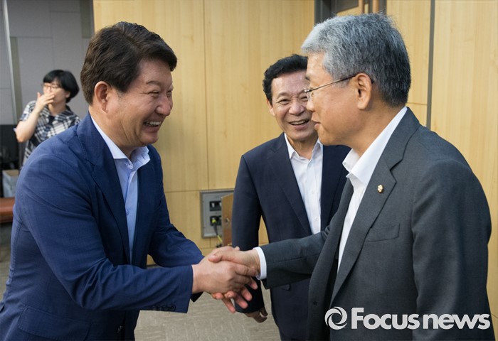 (서울=포커스뉴스) 8일 오후 서울 여의도 국회 의원회관에서 열린 광주시-대구시 예산·정책 간담회에 참석한 권영진(왼쪽부터) 대구시장, 윤장현 광주시장, 김동철 국민의당 광주시당 위원장이 인사하고 있다.