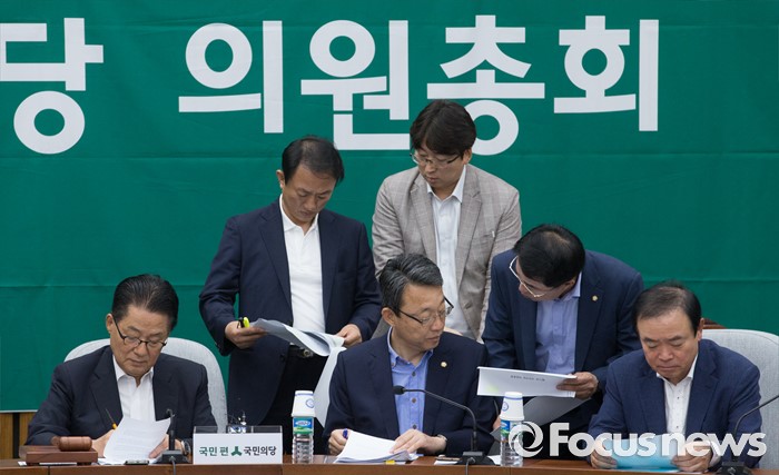 (서울=포커스뉴스) 9일 오전 서울 여의도 국회에서 열린 국민의당 의원총회에 참석한 박지원 비상대책위원장, 김성식 정책위의장, 김명진 비서실장, 최경환, 장병완 의원 등이 대화하고 있다.