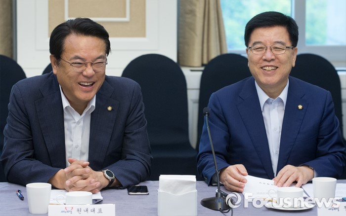 (서울=포커스뉴스) 9일 오전 서울 여의도 국회 귀빈식당에서 열린 2017년도 예산 당정협의에 참석한 정진석(왼쪽) 새누리당 원내대표와 김광림 정책위의장이 웃고 있다.