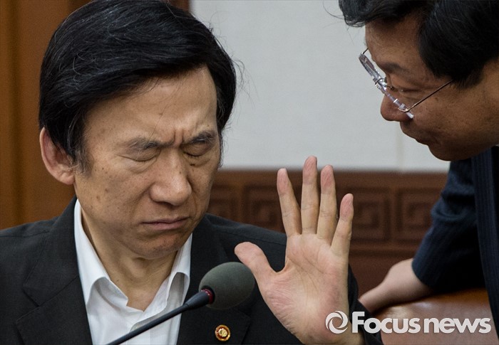 (서울=포커스뉴스) 9일 오전 정부서울청사에서 열린 국무회의에 참석한 윤병세 외교부 장관이 주형환 산업통상자원부 장관과 대화 중 손사래를 치고 있다.