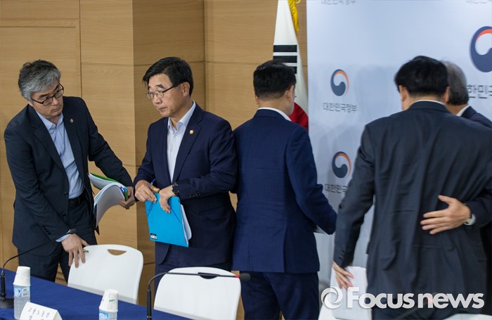 (서울=포커스뉴스) 9일 오전 정부서울청사에서 열린 '2016년 추경예산안 국회 조기통과' 관련 합동브리핑에 참석한 유일호(가운데) 경제부총리 겸 기획재정부 장관 및 관계부처 장차관들이 질의응답을 마친후 회견장을 나서고 있다.