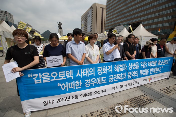 (서울=포커스뉴스) 9일 오전 서울 종로구 광화문광장에서 시민사회단체연대회의 회원들이 '갑을오토텍 사태의 평화적 해결과 상생을 위한 대화 호소 기자회견'을 하고 있다.