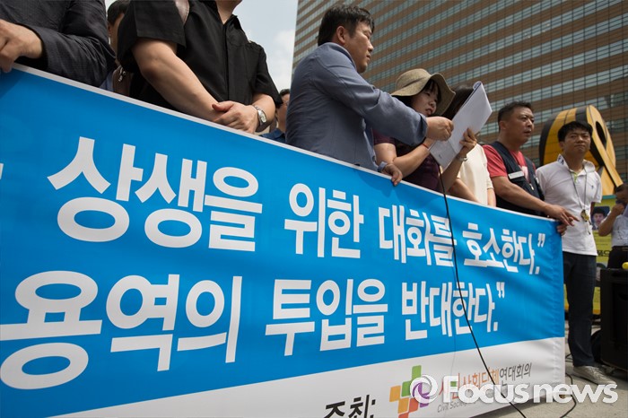 (서울=포커스뉴스) 9일 오전 서울 종로구 광화문광장에서 열린 시민사회단체연대회의 '갑을오토텍 사태의 평화적 해결과 상생을 위한 대화 호소 기자회견'에서 갑을오토텍지회 조합원 가족이 호소문을 낭독하고 있다.