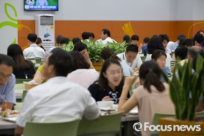 (서울=포커스뉴스) 수도권 대부분 지역에 엿새째 폭염경보가 내려진 9일 오전 서울 중구 한 구내식당이 직원들로 붐비고 있다.
