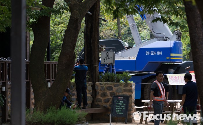 (남양주=포커스뉴스) 9일 오전 경기 남양주 봉주르 카페에서 남양주시 관계자들이 건축법 제11조 등 3건의 위반 건축물에 대한 행정대집행을 하고 있다.