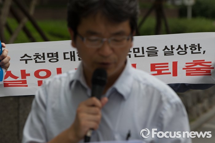 (서울=포커스뉴스) 9일 오후 서울 영등포구 옥시 한국 본사 앞에서 가습기 살균제 피해자와 유가족들이 옥시 최종배상안 철회와 상세한 수사를 촉구하며 기자회견을 하고 있다.