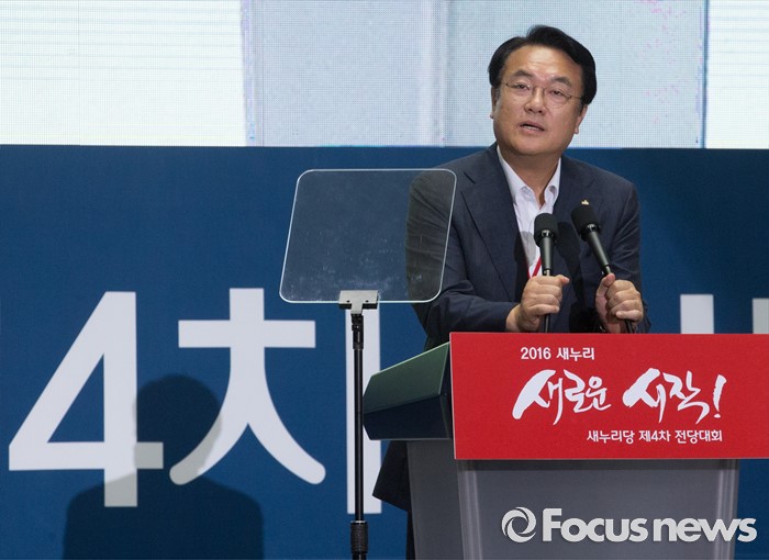 (서울=포커스뉴스) 9일 오후 서울 송파구 잠실실내체육관에서 열린 새누리당 4차 전당대회에 참석한 정진석 원내대표가 인사말을 하고 있다.