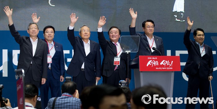 (서울=포커스뉴스) 9일 오후 서울 송파구 잠실실내체육관에서 열린 새누리당 4차 전당대회에 참석한 김희옥 혁신비대위원장, 정진석 원내대표 등 지도부가 인사하고 있다.
