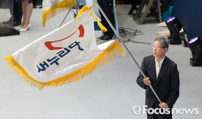(서울=포커스뉴스) 9일 오후 서울 송파구 잠실실내체육관에서 열린 제4차 새누리당 전당대회에서 김희옥 혁신비상대책위원장이 당기를 흔들어보이고 있다.