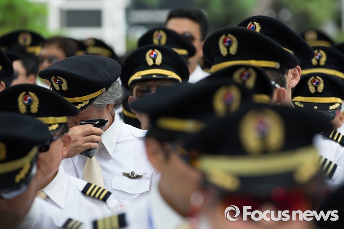 (서울=포커스뉴스) 9일 오후 서울 종로구 서울지방국세청 앞에서 열린 대한항공 경영정상화를 위한 세무조사 촉구대회에서 대한항공 조종사 노동조합 조합원이 땀을 닦고 있다.