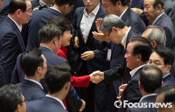 (서울=포커스뉴스) 박근혜 대통령이 9일 오후 서울 송파구 잠실실내체육관에서 제4차 새누리당 전당대회에 참석해 축사를 마치고 김희옥 혁신비대위원장과 인사를 하고 있다.