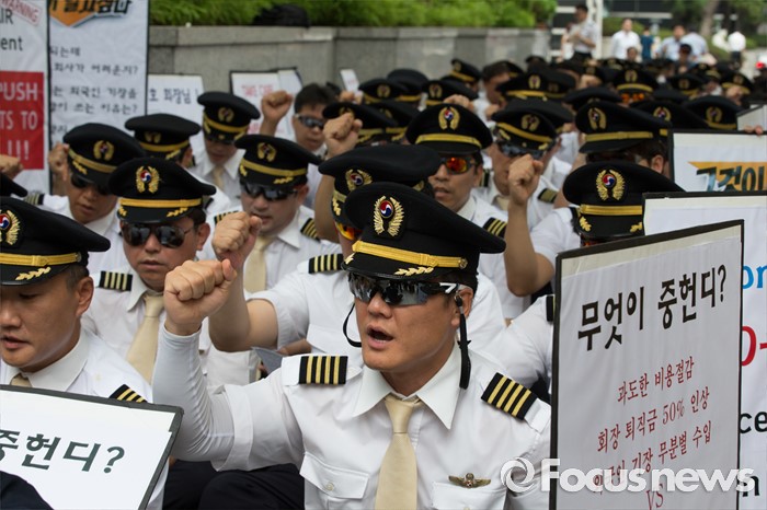 (서울=포커스뉴스) 9일 오후 서울 종로구 서울지방국세청 앞에서 열린 대한항공 경영정상화를 위한 세무조사 촉구대회에서 대한항공 조종사 노동조합 조합원들이 구호를 외치고 있다.