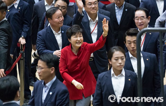 (서울=포커스뉴스) 박근혜 대통령이 9일 오후 서울 송파구 잠실실내체육관에서 제4차 새누리당 전당대회에 참석해 축사를 마치고 당원들에게 인사를 하고 있다.