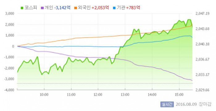 한편 이날 일본 닛케이225지수는 전일 대비 0.69% 상승한 1만6764.97로 마감했다.9일 유가증권시장 <그래픽출처=네이버>