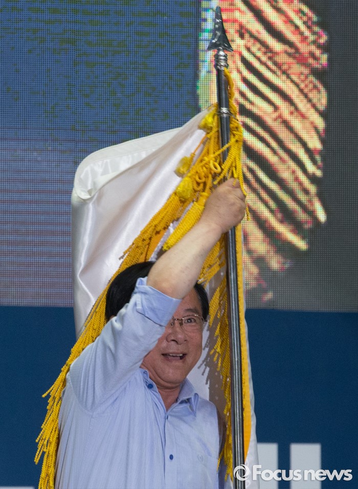 (서울=포커스뉴스) 9일 오후 서울 송파구 잠실실내체육관에서 열린 새누리당 4차 전당대회에 참석한 이주영 당대표 후보가 정견발표 중 당기를 흔들고 있다.