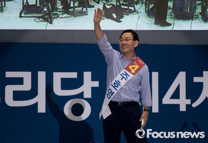 (서울=포커스뉴스) 9일 오후 서울 송파구 잠실실내체육관에서 열린 새누리당 4차 전당대회에 참석한 주호영 당대표 후보가 정견발표를 마친 뒤 인사하고 있다.