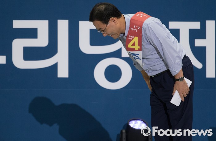 (서울=포커스뉴스) 9일 오후 서울 송파구 잠실실내체육관에서 열린 새누리당 4차 전당대회에 참석한 주호영 당대표 후보가 정견발표를 마친 뒤 인사하고 있다.