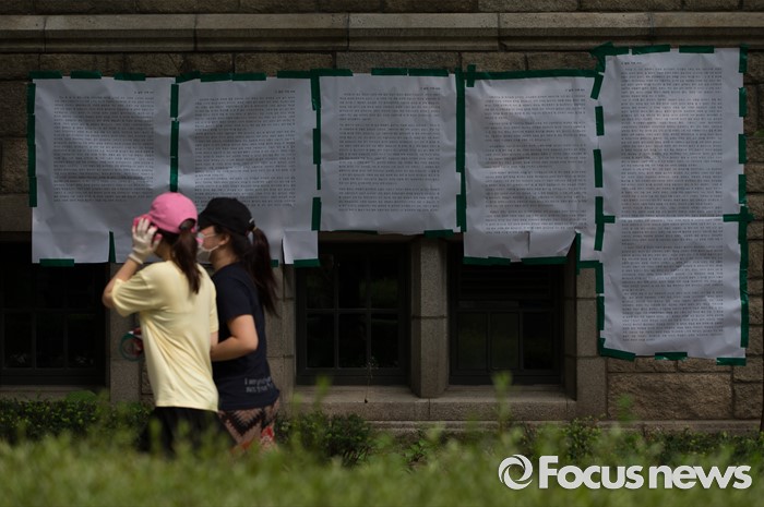 (서울=포커스뉴스) 이화여자대학교 최경희 총장이 학생들이 요구한 '9일 오후 3시까지 사퇴'를 거부한 9일 오후 서울 마포구 이화여자대학교에 붙은 대자보 앞을 학생들이 지나고 있다.