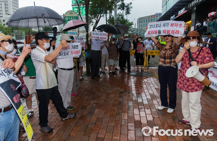 (서울=포커스뉴스) 9일 오후 서울 서초구 서초역 앞에서 도나도나 피해자 모임 관계자들이 '도나도나 돼지분양 사기사건' 재수사를 촉구하는 구호를 외치고 있다.