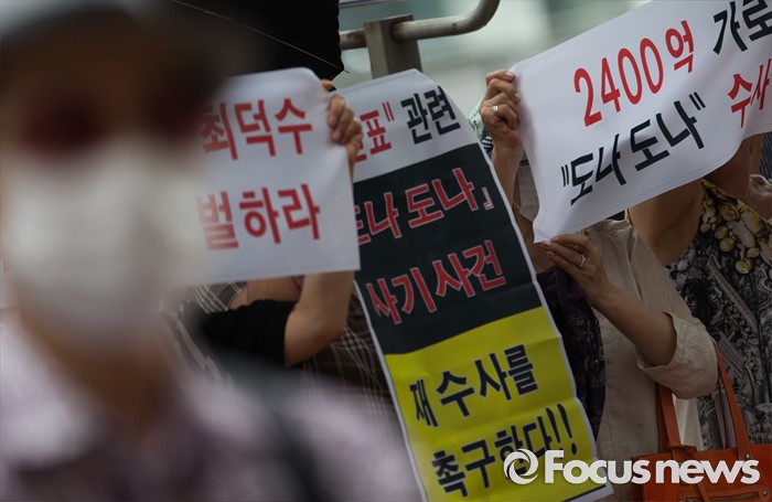 (서울=포커스뉴스) 9일 오후 서울 서초구 서초역 앞에서 도나도나 피해자 모임 관계자들이 '도나도나 돼지분양 사기사건' 재수사를 촉구하는 손피켓을 들고 있다.