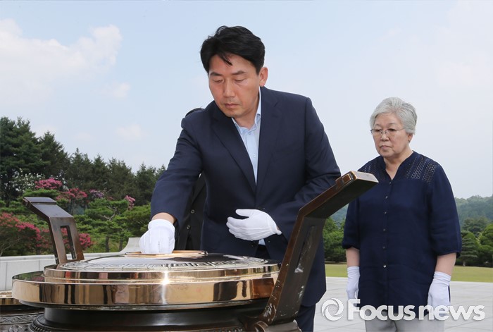 (대전=포커스뉴스) 9일 오후 대전 유성구 국립대전현충원 국가사회공헌자묘역에서 베를린 올림픽 마라톤 금메달리스트 손기정 선수의 딸 손문영 여사와 외손주인 이준승 손기정기념재단 사무총장이 현충탑에 분향하고 있다. 손기정 선수는 80년 전인 1936년 8월 9일 베를린 올림픽 마라톤에서 금메달을 목에 걸었다.