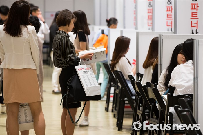반면 제약산업은 다른 행보를 보이고 있다. 제약·바이오 업종은 정반대로 3.7%의 고용증가율을 기록, 전체 업종 가운데 가장 높은 수준이다.(서울=포커스뉴스) 21일 오후 서울 강남구 코엑스 D2홀에서 열린 신세계그룹&파트너사 채용박람회에서 구직자들이 희망 부스를 둘러보고 있다.
